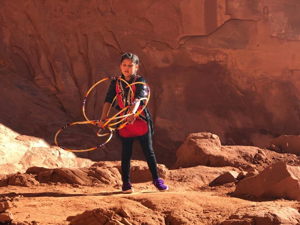 The tour also featured some of the amazing arches in the valley, including Big Hogan, Moccasin, Suns Eye and Ear of the Wind. At Big Hogan, we were treated to two very memorable performances. Bobby showed off his musical talent by serenading us with the Native American flute. The melody was very haunting and added to the mystical quality of the scene. Afterwards, ten year old Ayanibaa did a hoop dance for us, creating the shapes of a bird, basket, flower and lightening with her hoops. Her father Anthony accompanied her on a drum made from elk skin. The acoustics were perfect, as Big Hogan is a natural amphitheater.